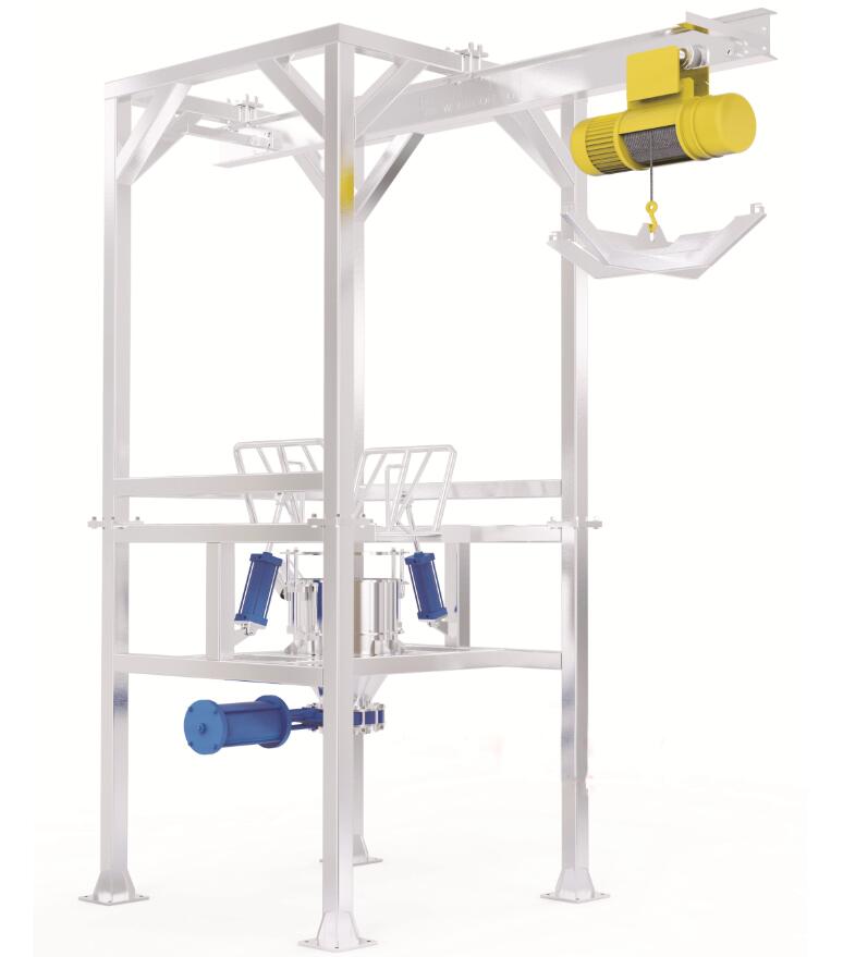 由提升机将吨袋提升至设备的进料口,由破袋机打开吨袋下料口,将吨袋内物料导入下料口,打开振动装置震动辅助下料,促进吨袋内的物料靠重力进入搅拌机或输送皮带,卸料完成后,吊出空袋,来完成整个拆包卸料过程。